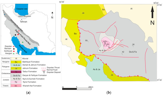 (a) Location of the Dopolan karstic bauxite in the Zagros fold belt. (b) Geological map of the Dopolan bauxite deposit (modified after [18]).