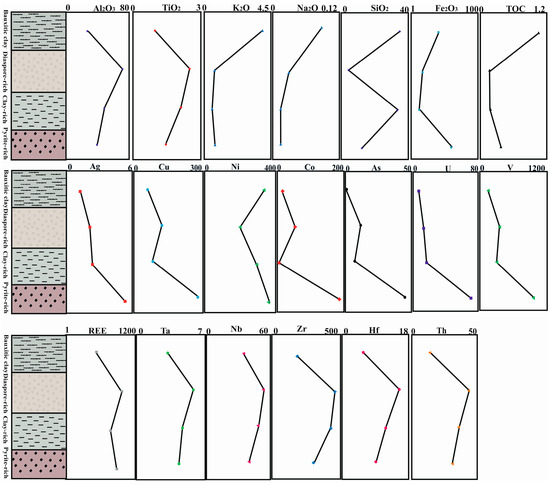 The geochemical data (Table 2) confirm the mineralogical results. The aluminum, titanium, potassium, and magnesium contents decrease from the top to bottom of the bauxite profiles, i.e., from the diaspore-rich to the pyrite-rich horizon (Figure 4). In contrast, the silica and iron content increases from the diaspore-rich to the pyrite-rich horizon (Figure 4). REE and immobile elements such as the HFSE (Th, Ta, Nb, Zr, and Hf) are enriched in the diaspore-rich bauxite and decrease to the bottom of the bauxite profile (Figure 4), whereas more mobile elements of the weathering profile such as redox-sensitive elements (Zn, Cu, Ni, Co, Ag, As, U, and V) increase from top to bottom (Figure 4). The total content of mobile elements is more than twice that in the pyrite-rich bauxite compared to other horizons.