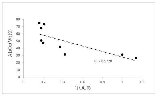 Al2O3 and TOC values of the Dopolan samples, displaying a negative correlation coefficient.