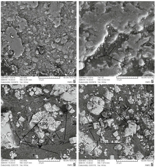 For the pH range 4–8 [53], it has been demonstrated that the mobility of most elements increased in soils with increasing Eh and vice versa. Additionally, some bacteria can play an important role in the mobility and precipitation of multiple redox state elements (e.g., Cu, Fe, Mn, Cr, and V) by means of their metabolic products [11,54,55,56]. Microorganism activity in the Dopolan bauxite deposit was demonstrated by microbial pyrite deposition (Section 6.2), and sulfur isotopic evidence (Section 6.4). Other important factors for the fixation of more mobile elements in the Dopolan deposit can be absorption by and/or adsorption onto the surface of pyrite and co-precipitation by clay minerals. Negatively charged surfaces of clay minerals offer extensive surfaces to adsorb positive charge elements largely in the pH range of 5 to 8 [7,10,11,54,55,56].