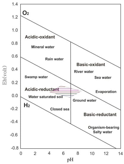 Eh–pH diagram illustrating the natural environmental conditions [40,43] of the stability fields of minerals in the Dopolan deposits. The thermodynamic data of the diagram were T = 25° and p = 1 bar.