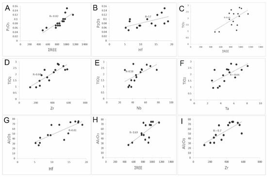 Variation diagrams showing the correlations between selected trace elements and Al2O3, P2O5, and TiO2. Positive correlation between P2O5 and ∑REE (A); mildly positive correlation between P2O5 and Hf (B); mildly positive correlation between TiO2 and ∑REE (C); Zr (D); Nb (E); Ta (F); Positive correlation between Al2O3 and Hf (G); mildly positive correlation between Al2O3 ∑REE (H); Zr (I).