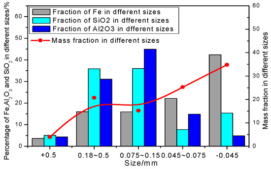 The size distributions of nickel slag and the fraction of Fe, SiO2 and Al2O3 in different sizes are shown in Figure 1. As can be seen from that, the samples possess the fineness of approximately 60% passing 0.074 mm, and above 95% passing 0.5 mm, which is beneficial to reduce the cost of grinding the load. In addition, the fraction of iron distributing in coarse size is low whereas the gangue minerals, such as SiO2 and Al2O3, are mainly present in the size of above 0.074 mm. Thus, it is essential to upgrade the slag by regrinding and re-concentration process.