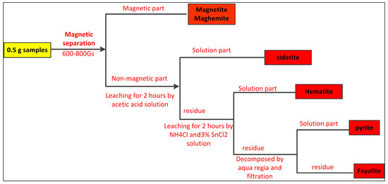 The chemical phase of iron was analyzed by selective separation according to the methods [23,24], and the flowsheet is shown in Figure 2.