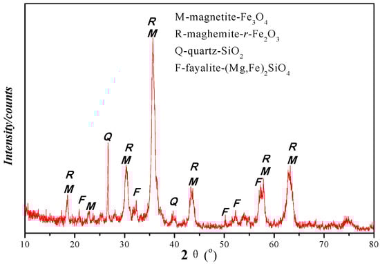 As can be seen from the above, it is worth noting that the magnetic part is a mixture of magnetic (Fe3O4) and maghemite (r-Fe2O3). The content of FeO was measured by chemical titration method [25], which all come from magnetic (Fe3O4). Therefore, the content of magnetic and maghemite can be calculated by Equations (2) and (3), respectively.