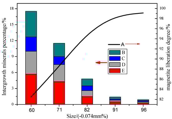 Liberation degree of magnetite within the nickel slag determined by microscopic image measurement method: A—Magnetite free liberation degree; B—The percentage of Intergrowth particles having greater than 75% magnetite; C—The percentage of Intergrowth particles having 50–75% magnetite; D—The percentage of Intergrowth particles having 25–50% magnetite; E—The percentage of Intergrowth particles with less than 25% magnetite.