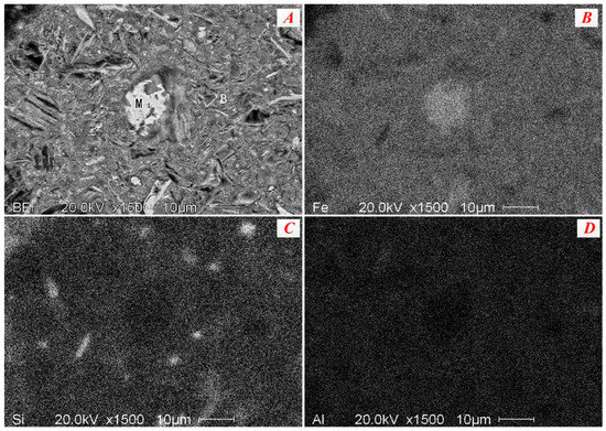 SEM back-scattered electron images of section minor magnetite as shown in Figure 4: M—magnetite, B—gangue minerals, (A) backscattering electronic image of fine magnetite particle; (B) surface scanning images of Fe; (C) surface scanning images of Si; (D) surface scanning images of Al.