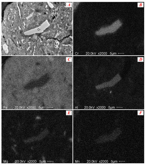 ESEM results of slag sample ((A) backscattering electronic image; (B–F) surface scanning images of Cr, Fe, Al, Mg and Mn, respectively. (Cr-picotite, B-gangue)).