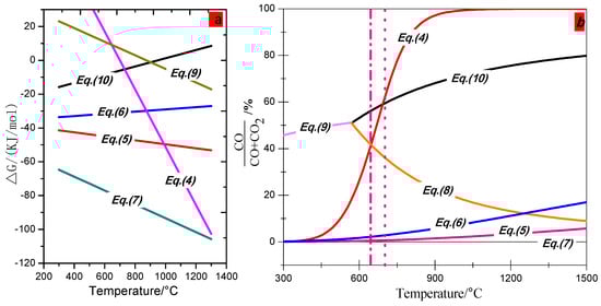 Thermodynamic analysis of reduction of metal oxides ((a) The standard Gibbs free energy of reactions (4)–(10) on the different temperatures; (b) Restore balance of cobalt oxide, nickel oxide and iron oxides).