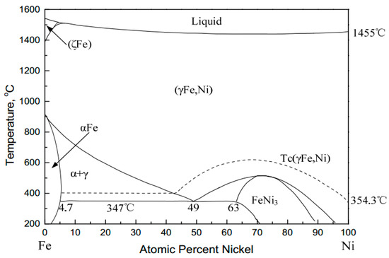 Generally, it is anticipated that the generation of metallic nickel and cobalt should be maximized as much as possible whereas the reduction of the iron oxide has to be restricted to the formation of magnetite in the reduction process [30,31,32,33]. However, it is inevitable that part of magnetite and wustite was further reduced to metallic iron under the experiment conditions. Moreover, metallic iron has a high affinity with metallic nickel to form a solid solution with Ni of a limited solubility, namely Fe-Ni (Fe-Ni-Co) alloy (as shown in Figure 11), which lead to low recoveries of Ni and Co in subsequent leaching process.