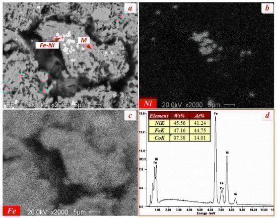 SEM image and EDS elemental maps of Ni-bearing minerals in nickel slag (M—magnetite; (a)—Backscattered photomicrograph of the alloys displaying the fine grain size; (b)—surface scanning images of Ni; (c)—surface scanning images of Fe; (d)—EDS pattern of Fe-Ni alloy).