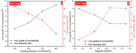 Effect of primary intensity of magnetic field on iron recovery under the condition of primary grinding fineness of −0.074 mm 77% is shown in Figure 13B. As can be seen from that, with an increase of magnetic field intensity from 0.21 T to 0.29 T, the iron recovery was elevated from 79.98% to 84.96%, and iron grade was decreased slightly. Thereafter, it had no significant change when magnetic intensity was further intensified to 0.33 T. Hence, from those experiments, the magnetic field intensity of 0.29 T was taken in the following work.