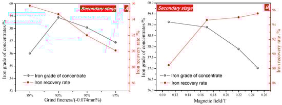 The results of secondary stage grinding-low intensity magnetic separation process: (A)—Effect of secondary grinding fineness on iron recovery at 0.17 T magnetic field; (B)—Effect of primary intensity of magnetic field on iron recovery under the condition of secondary grinding fineness of −0.074 mm 93%, no dispersing agent.