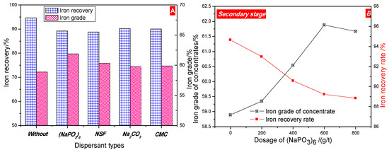Effects of dispersant on recovery of iron: (A) Effect of dispersant types on iron recovery (600 g/t); (B) Effect of (NaPO3)6 addition on iron recovery.
