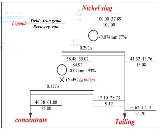 In order to further increase the quality of iron concentrate, different kinds of dispersant were employed to improve the magnetic separation by preventing magnetic aggregation, and results are shown in Figure 15. The results show that sodium hexametaphosphate ((NaPO3)6) has the best dispersing effect for nickel slag. Meanwhile, it is also seen from Figure 15B that the iron grade was increased gradually and reached its peak of 61.89% when the dosage of (NaPO3)6 was raised to 600 g/t, thereafter it remained nearly constant, while the iron recovery was present as the opposite tendency, which reveals the addition of (NaPO3)6 is beneficial to iron grade of concentrate due to the fact that the dispersant can improve the interparticle repulsive force and weaken interparticle magnetic interattraction. Hence, the suitable fineness and intensity of magnetic field in the primary and secondary separation processes should be 77%-0.074 mm and 93%-0.074 mm, as well as 0.29 T and 0.17 T, respectively, and the suitable dosage of (NaPO3)6 is 600 g/t. The magnetic concentrate, assaying total iron grade of 61.88% was obtained at an overall iron recovery of 75.80%.