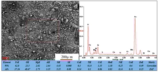The magnetic concentrate contains 61.88% total iron, 4.21% SiO2 and minor other impurities, such as sulfur and phosphorus. In addition, more notably, the content of Al2O3 and Ni is a little higher within the magnetic concentrates. However, it still can be used as sintering and pelletizing feed blending with other low aluminum and nickel iron ores in ironmaking [36]. The tailings, with the main components of Fe, MgO, Al2O3 and SiO2 mixture are maybe used as raw materials for production of cement, which can avoid land occupancy and minimize environmental risks. The SEM-EDS image of product, as shown in Figure 17, further confirms the minor elements, such as Ni, Cr, exist in magnetite concentrates.