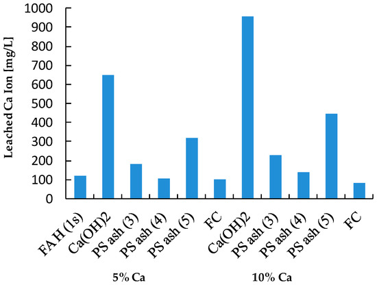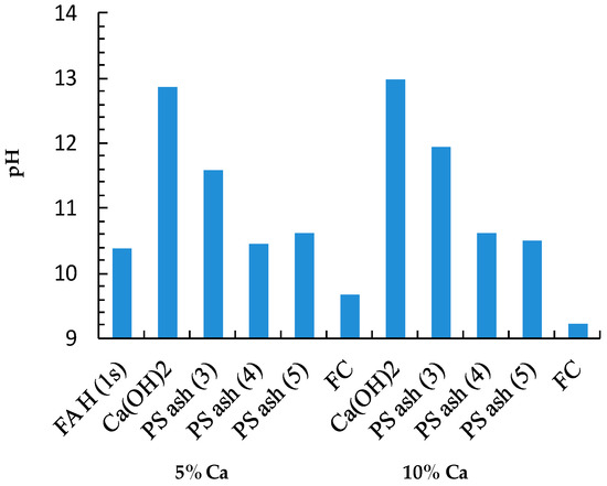 A strong relationship between the pH of the leachate and CaO content has been recognized since this mineral elevates pH in the leachates [20,21,22,23]. Figure 1 shows the effect of including additives in the pH of the leachates, where it increased with the treated amount. However, each additive had a different way of elevating pH that was related to their properties. Of the four additives discussed (after FAH-Ca(OH)2 mixture leachates), the FAH-PS Ash 3 mixture leachates showed the highest final pH over FAH-PS Ash 5, FAH-PS Ash 4 and FAH-FC mixture leachates for both 5% and 10% Ca content samples, as shown in Figure 1. This indicated that the relatively higher CaO content of PS Ash 3 added into fly ash tended to increase the pH of the mixtures leachates. This was consistent with the previous study in Reference [24], where the release of Ca from CaO minerals yielded Ca(OH)2 in aqueous solutions, which is an oxide mineral that significantly contributes to alkalinity. Conversely, FC, which contained the highest CaO content, did not appear to have any impact on elevating the pH of the mixture leachates.