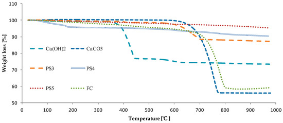 TG was performed on Ca(OH)2 and CaCO3 of 99.9% purity to confirm that the two weight losses in the TG curve of additives were due to the thermal decomposition of Ca(OH)2 and CaCO3. Figure 3 compares the TG curves of each calcium compound and the additives. The TG analysis of Ca(OH)2, CaCO3, and additives was conducted under a nitrogen atmosphere based on the methods decribed in References [25,26]. Based on previous study, Ca(OH)2 was thermally decomposed at 330–460 °C into CaO [26], and CaCO3 was thermally decomposed into CaO at around 700 °C [27]. As seen in Figure 3, the weight losses in PS Ash 3 at around 390 °C and 600 °C corresponded to the thermal decompositions of Ca(OH)2, and CaCO3. The weight losses in PS Ash 4 (around 600 °C), PS Ash 5 (around 590 °C), and FC (around 700 °C) corresponded to the thermal decomposition of CaCO3. From these results, it was found that the Ca(OH)2 and CaCO3 in additives could be detected by TG. Since the decomposition temperature of CaO is above 1000 °C [25] and cannot be detected by TG, the analysis of calcium compounds in the additives was performed using the XRD method.