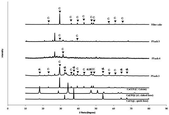 Figure 4 shows the X-ray diffraction patterns of several calcium compounds and additives. All of the peaks in the additives were compared with the peaks in each calcium compound. The results showed that PS Ash 3 contained CaCO3, CaO, and Ca(OH)2; PS Ash 4 and PS Ash 5 contained small amounts of CaCO3, while FC contained the most amount of CaCO3. The XRD analysis results were consistent with the TG analysis results described above, and revealed that a relatively high content of CaCO3 in the FC caused this additive to yield low amounts of leached Ca ions and produce a relatively low value of pH mixture leachates, which was considered to be due to CaCO3 being an insoluble substance in pure water. Therefore, the contents of CaO and Ca(OH)2 (as water soluble Ca) in PS Ash 3 caused this additive to yield high amounts of leached Ca ions and a higher value of pH mixture leachate than that of PS Ash 4, PS Ash 5, and FC. Regarding the higher amounts of leached Ca ions in PS Ash 5 than in PS Ash 3 (Figure 2), this could be attributed to the relatively high content of SO3 (detected by XRF) as an acid compound in PS Ash 5 (see Table 2). This is consistent with the reported study by Killingley et al. [28], where the balance between the concentration of alkaline-earth element, Ca, in the ashes, and the proportion of potentially acid generating SO3 influenced the initial pH and leached Ca ions of the ash-water system.