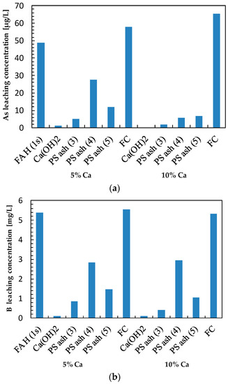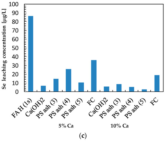 In contrast to arsenic and boron, FC showed some effect on selenium leaching suppression. The decrease in selenium leaching may have been due to the presence of Al2O3 and Fe2O3, as well as the Ca content and leached Ca ion content in FC, as reported by previous observations where Se was controlled by sorption reactions that occurred on the surface of metal oxides such as Al2O3 and Fe2O3 [35,36]. These oxides may provide additional surface area to which positively charged ions may attach, resulting in decreased Se concentration in aqueous solutions [37].