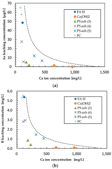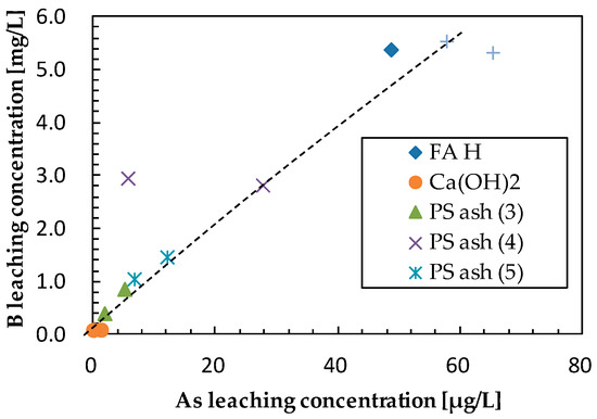 For a boron leaching suppression effect of FC like that observed with arsenic, FC did not have an inhibitory effect on boron leaching. Overall, the mechanism to suppress the leaching of arsenic and boron is similar. Figure 9 shows the relationship between the arsenic leaching concentration and the boron leaching concentration plotted for all samples. In general, they have a good correlation, indicating that As and B can be suppressed simultaneously.