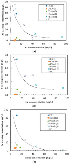 Figure 7c shows the relationship between the leachate pH and the selenium leaching concentration for all samples. As with arsenic and boron, the pH and the selenium leaching concentration also showed a linear relationship; in general, the selenium leaching concentration decreased with increasing pH, and selenium leaching was suppressed as the pH of the leachate became 11 or higher. This finding was consistent with Izquierdo et al. [21], Morar et al. [32], Jankowski et al. [33], and Solen-Tishmack et al. [34], who claimed that the Se concentrations decreased with an increase in pH above 11 due to the substitution of Se in the structure of ettringite. Figure 5c shows that selenium leaching was suppressed in PS Ash 4 and 5. Although the pH was lower than 11, it is thought that alkaline elements other than Ca also contributed to the suppression of selenium leaching. Therefore, the concentration of alkaline elements in the leachate (such as Na, K, and Mg) were measured and the relationships between them and selenium leaching concentrations were examined. Figure 8c shows the relationship between the Na ion concentration and the selenium leaching concentration in the mixture leachates. As seen in Figure 8c, it seemed that the Na ion concentration showed a corresponding correlation to the selenium leaching concentration, where the selenium leaching concentration tended to decrease as the Na ion concentration increased. For K and Mg (as shown in Figure A1c and Figure A2c), neither of them were clearly related to the selenium leaching concentration. This result showed why PS Ash 4 and 5 could suppress selenium leaching as an effect of the Na ions. The reasons as to why the Na ion concentration is one of the alkaline elements other than Ca that influence the selenium leaching concentration has also been insufficiently considered, but is needs to be further understood in order to be able to estimate further mixture compositions of additives to more effectively suppress selenium leaching.