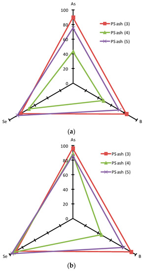 As shown above, PS Ash had the effect of simultaneously suppressing the leaching of As, B, and Se, and it has become clear that it is very promising as a practical leaching suppression material. Although FC had some effect on Se leaching suppression, it did not work for As and B, and was found overall to be inappropriate as a leaching suppression material. Figure 12 plots the leaching inhibition rates of As, B, and Se by the PS Ash as radar charts for the Ca 5% and 10% samples. In these figures, it can be comprehensively evaluated that the one having the largest area had the effect of simultaneously suppressing As, B, Se. From this figure, PS Ash 3 was the most suitable material as a suppression material, followed by PS Ash 5 and PS Ash 4, respectively. For the three elements As, B, Se, the only elution suppression material satisfying the soil environmental standard was PS Ash 3, with a Ca = 10% setting.