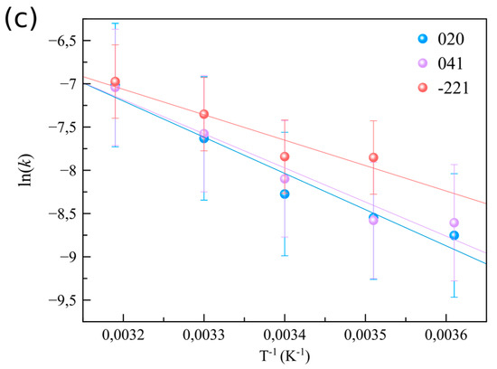 | This work | 25.0–35.0 | (020) EA = 35.2 ± 0.6 kJ·mol−1; (041) EA = 33.1 ± 0.6 kJ·mol−1; (−221) EA = 24.9 ± 0.7 kJ·mol−1 |