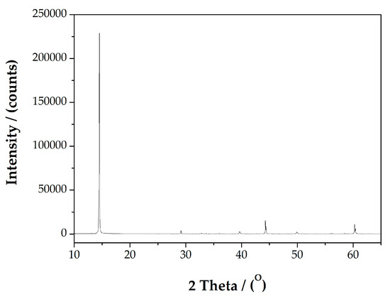 Pure molybdenite crystals (PM) used in this study were obtained from the tungsten–molybdenum Mine of Luanchuan in Henan Province, China, as well. They were first selected by hand to obtain high-grade crystals, then crushed and ground in a porcelain ball mill prior to collectorless flotation to further enrich the molybdenite. The enriched molybdenite was screened to obtain the −38 µm fraction for analysis. This material assayed 58 wt % Mo. The XRD analysis indicates 99 wt % molybdenite as shown in Figure 1.