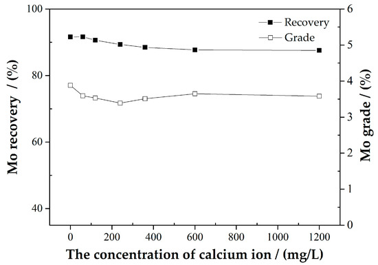 To further confirm the deleterious effect of Ca2+ on the flotation of fine molybdenite at pH 8, flotation of PM below −38 µm was conducted as a function of Ca2+ concentration and the results are shown in Figure 4.