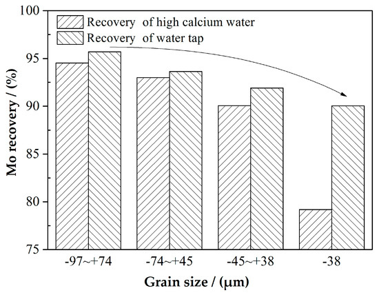 Figure 3 shows molybdenite recovery in AM flotation from different size fractions in the absence and presence of 800 mg/L Ca2+ at pH 8. It is clear that Ca2+ had a greater depression effect on the flotation of molybdenite from a fine size fraction than from an intermediate size fraction. For example, from −38 µm size fraction, molybdenite recovery decreased from about 90.1% in the absence of Ca2+ to about 79.1% in the presence of 800 mg/L Ca2+, while from −97 + 74 µm size fraction, molybdenite recovery only decreased from about 96.0% in the absence of Ca2+ to about 94.0% in the presence of 800 mg/L Ca2+. Obviously, the depression of Ca2+ on molybdenite flotation shown in Figure 2 is mainly attributed to depression from fine size fractions. As reported by Zanin et al. [10], Ca2+ did not affect the contact angle on molybdenite faces but reduced the contact angle on molybdenite edges at pH 8 [10]. This explains the more deleterious effect of Ca2+ on the flotation of fine molybdenite with a high proportion of edges in Figure 3.