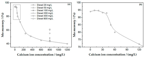 At 20 mg/L diesel, molybdenum recovery remained high at about 94% when Ca2+ concentration was below 40 mg/L. Then, with Ca2+ concentration increasing, molybdenum recovery decreased significantly. At 600 mg/L, molybdenite recovery was about 45%. The decrease of molybdenite recovery slowed down when Ca2+ concentration was above 600 mg/L.