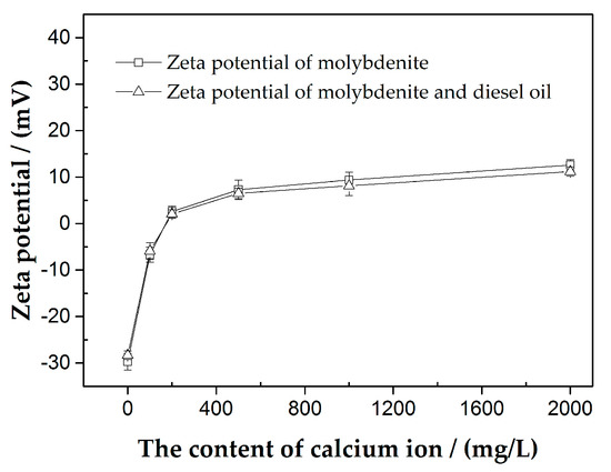 Figure 5 indicates that the zeta potential of molybdenite was about −30 mV in the absence and presence of 20 mg/L diesel without the addition of Ca2+. Obviously, the adsorption of diesel on molybdenite had little effect on the zeta potential of molybdenite. It has been documented that molybdenite edges are hydrophilic and composed of Mo–S bonds, while molybdenite faces are hydrophobic and composed of S–S bonds [10,15,21]. Oily collectors such as kerosene, diesel oil, transformer oil, and solar oil only adsorb on molybdenite faces through hydrophobic interactions and van der Waals forces [11,21,22,23]. Apparently, the zeta potential in Figure 5 was mainly controlled by molybdenite edges on which diesel were not adsorbed. Given the fine size (−38 µm) of molybdenite particles in the zeta potential measurements, molybdenite edges are predominant over molybdenite faces.