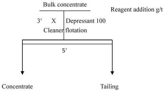 The bulk concentrate (pulp slurry) was obtained from Luming Mining Co., Ltd., Yichun, China (with about 5.0% Cu and 6.0% Mo collected from a day shift) and used in the bench scale tests. The experiments were conducted in a series of flotation cells with a volume capacity of 1.5 L (XFG, Jilin Prospecting Machinery Factory, Changchun, China). The feed was added to the flotation cell with recycled water to obtain the required pulp density. The beneficiation flowsheet of the bench scale tests are presented in Figure 1. The concentrate and tailing were filtered, dried, weighted, sampled, and assayed for copper and molybdenum.
