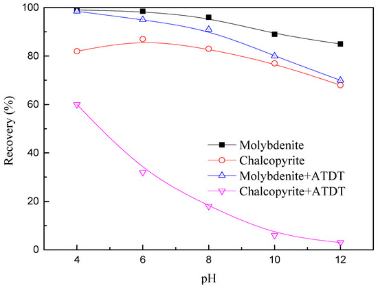 The recoveries of molybdenite and chalcopyrite in the presence and absence of depressants as a function of pH have been performed. It can be seen from Figure 2 that the recovery of molybdenite without depressants decreased with increasing pH, which might be due to the transformation of the molybdate ionic species (HMoO4− and MoO42−) in solution and responsible for the reduction in its floatability [29]. On the other hand, the recovery of chalcopyrite increased with increasing pH up to about 6.0–8.0 and thereafter decreased, which may have been be due to the formation of hydrophilic iron oxy-hydroxy species on the chalcopyrite surface. The flotation test results of pure mineral indicated that it was impossible to separate molybdenite from chalcopyrite without the addition of a depressant. However, the floatability of chalcopyrite dropped significantly when 4 × 10−4 mol /L ATDT was added, while the recovery of molybdenite decreased slightly. In general, there was a considerable separation window in the pH range of 8–12, indicating that the potential of using ATDT as a selective depressant for chalcopyrite. Taking both separation efficiency and economical cost into consideration, the optimal pH value for the flotation separation of molybdenite from chalcopyrite should be about 8.0.