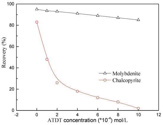 The plots of the floatability of molybdenite and chalcopyrite as a function of depressant concentration at pH 8.0 are shown in Figure 3. It was apparent that the recoveries of chalcopyrite and molybdenite decreased simultaneously with the increase of depressant concentration. However, the recovery of chalcopyrite dropped sharply with the increase of ATDT concentration, whereas the recovery of molybdenite decreased insignificantly. In other words, as the depressant concentration increased, the hydrophilicity of chalcopyrite was enhanced while the hydrophobicity of molybdenite was independent of the depressant. Furthermore, the observation also indicated that the separation window between chalcopyrite and molybdenite enlarged gradually with the increase of depressant concentration. Therefore, satisfactory separation results could be achieved by adopting ATDT as a potential selective depressant in copper-molybdenum flotation separation.