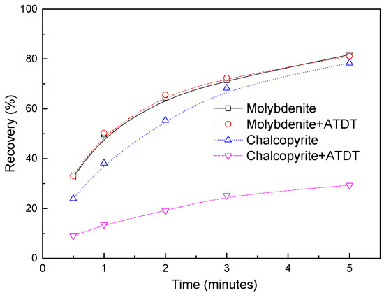 Pure mineral flotation tests only showed a marginal effect of ATDT as a potential selective depressant in Cu-Mo flotation separation [3]; however, the single mineral flotation tests could not demonstrate the competitive adsorption of ATDT on the two minerals. Therefore, further test works were conducted on the flotation separation of Cu-Mo bulk concentrate in the presence and absence of ATDT as depressants through an open circuit. A kinetic flotation test with and without ATDT was performed to evaluate the difference of the parameter fitted by kinetic models. The kinetic flotation tests were conducted according to the flowsheet in Section 2.6.2. In this section, the classical first-order flotation model was adopted to calculate the flotation rate constant and the selectivity index [30].