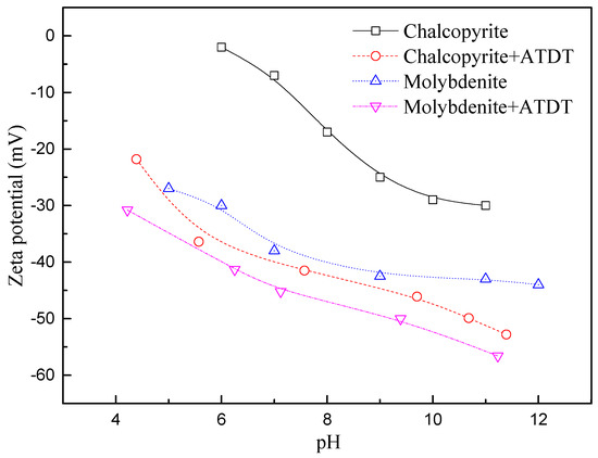 The zeta potential curves for chalcopyrite in the presence and absence of a depressant showed that the chalcopyrite surfaces were negatively charged throughout the tested pH range. The isoelectric point of chalcopyrite was set at about pH 5, which was consistent with the reported value [32,33]. As seen in Figure 6, the addition of a depressant made the chalcopyrite surfaces more negatively charged in the entire pH range, which indicated the adsorption of the reagent on the chalcopyrite surface [34]. The zeta potential of the negatively charged pure molybdenite in the tested pH range was attributed to the transformation of the molybdate ionic species (HMoO4− and MoO42−) [29]. It is clear from Figure 6 that ATDT might adsorb onto the molybdenite, therefore making the zeta potential more negative. Compared to the Δzeta potential value of chalcopyrite and molybdenite, a conclusion could be drawn that the presence of the depressant had a little influence on the zeta potential of molybdenite rather than that of chalcopyrite, indicating the higher adsorbed amount of depressant on chalcopyrite rather than molybdenite. The molecular structure of ATDT contains primary amine (-NH2) and thione (C=S) groups, which like most dithiocarbazones can undergo thione-thiol tautomerization [14]. The more negative of the chalcopyrite treated by depressant may be associated with the chemisorption of ATDT through nitrogen (-NH2) and sulfur (-SH) atoms to form Cu complexes on chalcopyrite surface. However, for molybdenite, the possible physisorption mechanism might dominate through hydrogen bonds or electrostatic forces.