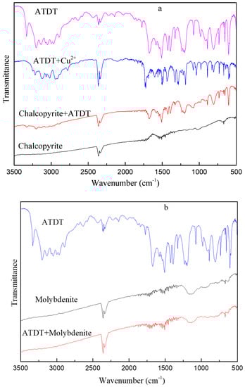 The Fourier Transform Infrared Spectroscopy (FT-IR) spectra of the (a) ATDT, ATDT-Cu complexes, chalcopyrite before and after treatment; and (b) ATDT, molybdenite before and after treatment.