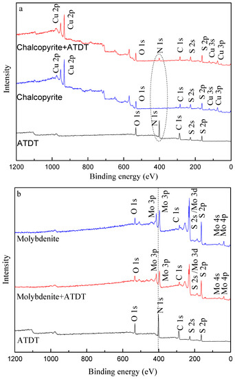 The XPS spectra of ATDT, molybdenite and chalcopyrite (before and after treatment) over a binding energy of 1200–0 eV are presented in Figure 8a,b. The atomic content of molybdenite and chalcopyrite, before and after treatment, are listed in Table 3. For chalcopyrite, the atomic concentration of C and N atoms on chalcopyrite surface increased after ATDT treatment, while that of O, S, Cu, and Fe atoms decreased, confirming the adsorption of ATDT on the chalcopyrite surface. While, Table 3 demonstrates that the atomic concentration of C, N, and O on the molybdenite surface increased after ATDT treatment, demonstrating the adsorption of ATDT onto the molybdenite surface. However, the Δ values of atomic concentration for N on chalcopyrite surfaces was far greater than that of the molybdenite surface, which indicated that the adsorption of ATDT on the chalcopyrite surface was higher than that of molybdenite surface, which was consistent with the results of FT-IR and zeta potential measurements.