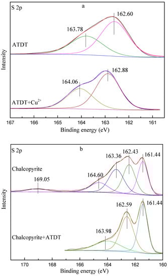 The S 2p XPS spectra of ATDT, ATDT-Cu complexes, and chalcopyrite before and after treatment are displayed in Figure 9a–c. In Figure 9a, the S 2p XPS spectra of ATDT at around 162.60 and 163.78 eV were attributed to the thione sulfur of C=S and thiol sulfur of C—SH [24]. The S 2p spectrum of the ATDT-Cu complexes were composed of two components located at around 162.88 and 164.06 eV, respectively, demonstrating that the electron density of S atoms in ATDT-Cu complexes changed. In Figure 9b, the S 2p line of chalcopyrite can be fitted by five doublets with binding energies of 161.44 (S2−), 162.43 (S22−), 163.36 (Sn2−/S0), 164.60 (Loss), and 169.05 eV (SO42−), respectively. These results agreed well with those reported values for S2− and S22− centered at 161.5 eV and 162.48 eV [37,38,39] , respectively. On the other hand, the positions of the S 2p for Sn2−/S0; and SO42− species were reported to be 163.4 and 168.5/169.3 eV [40,41,42], which were very close to our experimental data, indicating the oxidation of chalcopyrite. After ATDT treatment, the S 2p spectrum of chalcopyrite could be divided into three components with the binding energy centered at 161.44, 162.59 and 163.98 eV, respectively. It should be noted that the former two doublets might be attributed to the sulfur atoms of the original chalcopyrite, which shifted by 0 and 0.16 eV, respectively. However, the binding energy at 163.98 eV was very close to the values of the ATDT-Cu complexes and with a slightly shift of 0.08 eV, which was consistent with the IR results of copper complexes indicating that sulfur atoms of ATDT might act as the reaction site.