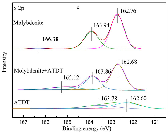 In the high-resolution S 2p spectra of molybdenite, the peaks of two doublets were centered at 162.76 and 163.94 eV, which corresponded to the sulfur species of S22− and Sn2−/S0, respectively. In addition to the two S 2p doublets, Figure 9c presented another peak positioned at 166.38 eV, which was attributed to the SO32− species [40] indicating the oxidation of molybdenite. After the adsorption of ATDT, another peak was found centered at 165.12 eV, which is a typical characteristics of the S species [43], demonstrating that proper oxidation of the molybdenite surface benefitted the hydrophobicity of molybdenite. In other words, ATDT might benefit the oxidation of the sulfur species (S22−/Sn2−) to form S rather than SO32− or SO42− products. Furthermore, the S 2p spectra of ATDT could not be observed on the treated molybdenite surface, indicating that the adsorption of ATDT on molybdenite could not be detected. Although it seems that these findings might contradict the observation of the zeta potential of molybdenite in the presence and absence of ATDT, this contradiction could be explained by the potential factor that weakly adsorbed ATDT molecules were removed before the XPS measurement during the sample preparation process of washing and/or in the high vacuum of the XPS chamber [44].