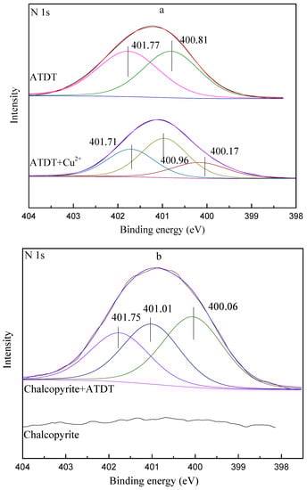 The N 1s XPS spectra of the ATDT, ATDT-Cu complexes, and chalcopyrite before and after treatment are shown in Figure 10a,b. The N 1s XPS spectra of ATDT showed two peaks at around 400.81 and 401.77 eV, which were assigned to the nitrogen atoms of C=N—NH—C and C—N—NH2, respectively [24]. For the ATDT-Cu complexes, the N 1s XPS spectra was divided into three components centered at 400.17, 400.96, and 401.71 eV, respectively. The former peak located at around 400.17 was likely associated with the Cu—N group, which was consistent with the reported data [45], while the N 1s peaks at 400.96 and 401.71 eV were assigned to C=N—NH—C and C—N—NH2, respectively. The difference of N binding energy between the ATDT and ATDT-Cu complexes confirmed the involvement of nitrogen atoms as reaction sites. After the adsorption of ATDT (Figure 10b), the N 1s peaks could be fitted by three components centered at around 400.06, 401.01, and 401.75 eV, which were very close to the values of ATDT-Cu complexes (400.17, 400.96, and 401.71 eV). The observation of lower binding energy at 400.06 eV was likely derived from the Cu—N group, which was very close to the value presented by the ATDT complexes (400.17 eV), confirming the involvement of nitrogen for the formation of metal complexes on the chalcopyrite surface.