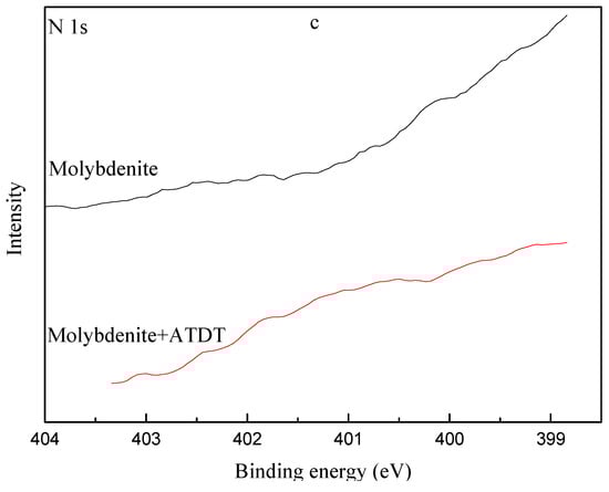 The high resolution of the N 1s spectra of molybdenite before and after treatment with ATDT are shown in Figure 10c. It was clear that the XPS spectra of N 1s from treated molybdenite and original molybdenite were almost identical in peak shape. In other words, after the pretreatment of molybdenite with ATDT, no obvious N 1s peaks were observed, confirming that the nitrogen atomic concentration on the surface of molybdenite could be attributed to the contamination of unknown nitrogen resources.