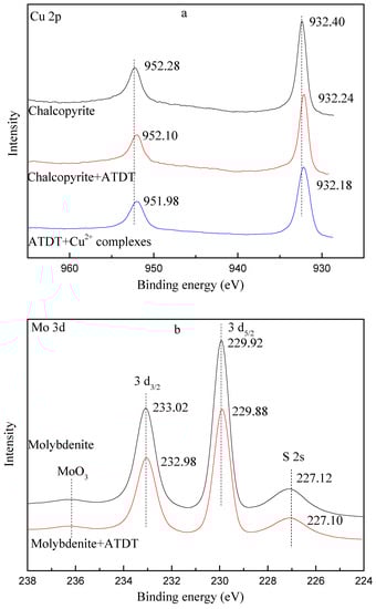 Cu 2p spectrum of (a) ATDT-Cu2+ complexes, chalcopyrite before and after treatment; (b) Mo 3d spectrum of molybdenite before and after treatment.