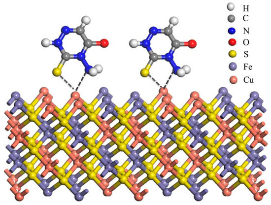 The results of the zeta potential measurements suggested that ATDT might chemisorb onto the chalcopyrite surface, thus decreasing its zeta potential significantly, which was identified by FT-IR. The XPS analysis results further demonstrated that ATDT might adsorb on the chalcopyrite surface through N and S atoms to form five member rings. Based on the above findings, the predicted adsorption modes were postulated for the surface interaction between ATDT and chalcopyrite (Figure 12).