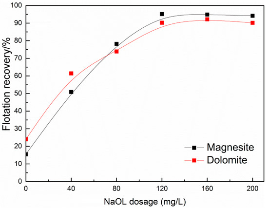 Effect of NaOL dosage on the flotation recovery of magnesite and dolomite.