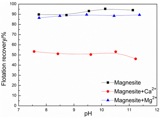 The following experiments were carried out to determine the effects of Mg2+ and Ca2+ on the flotation separation of magnesite from dolomite, which is shown in Figure 5. The chemical analysis results showed that the dissolved concentrations of Ca2+ and Mg2+ in the pulp of a magnesite–dolomite mixture were about 20 mg/L. Thus, the addition quantities of Ca2+ and Mg2+ are 20 mg/L in the following experiments. It can be seen from Figure 5 that the floatability of magnesite changes slightly in the presence of Mg2+. The recovery of magnesite is above 85% in the alkaline pH range, which suggests that Mg2+ has little effect on the flotation of magnesite. On the contrary, the recovery of magnesite is below 55% in the alkaline pH range in the presence of Ca2+. It demonstrates that Ca2+ has a strong prohibitive impact on magnesite in the pH range of 7–12 using SH as depressant.