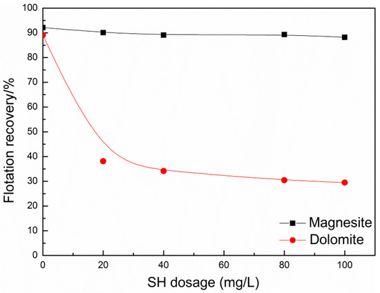 The effect of pH on the floatability of magnesite and dolomite in the presence of SH is shown in Figure 4. Figure 4 illustrates that SH has a significant depression effect on dolomite in the pH range of 7–12. The recovery of dolomite is below 50% in the alkaline pH range. Different from dolomite, the magnesite flotation is not obviously influenced by SH addition at alkaline conditions and the recovery of magnesite is still up to 85%. Therefore, it is possible to separate magnesite from dolomite at alkaline conditions by using SH as the depressant.