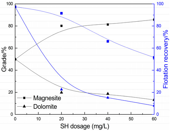The pure mineral flotation results suggest that it may be possible to float magnesite away from dolomite by adding SH before Na2CO3. The flotation separation tests of the magnesite–dolomite mixture mineral (mass ratio is 1:1) were studied at pH 10.5 under the new addition order and the results are shown in Figure 7. It can be seen from Figure 7 that with the SH dosage increasing from 0 to 60 mg/L, the magnesite grade increases from 49.85% to 85.78% and the recovery decreases from 97.39% to 51.57%. By contrast, the dolomite grade decreases from 50.15% to 13.22% with an increase in the dosage of SH and the flotation recovery of dolomite decreases from 97.46% to 7.95%. It indicates that, with the change in the adding sequence of SH and Na2CO3, the grades of magnesite and dolomite have different change trends and the recovery of magnesite has declined. So, magnesite and dolomite can be selectively separated. According to the indicators of flotation, such as the dosage of SH, grade, and flotation recovery, the optimum dosage of SH is 20 mg/L.